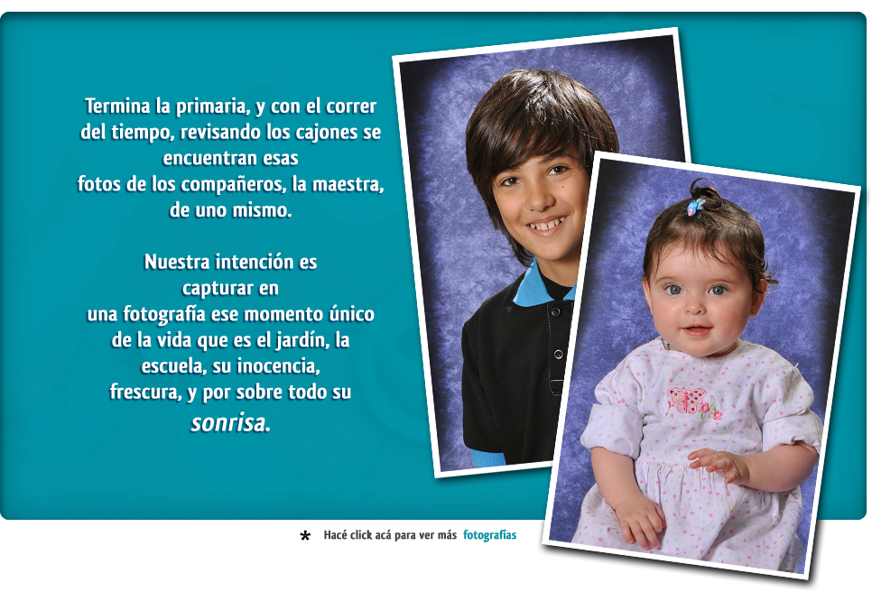Nuestra intención es capturar en una fotografía ese momento único de la vida que es el jardín, la escuela, su inocencia, frescura, y por sobre todo su sonrisa.